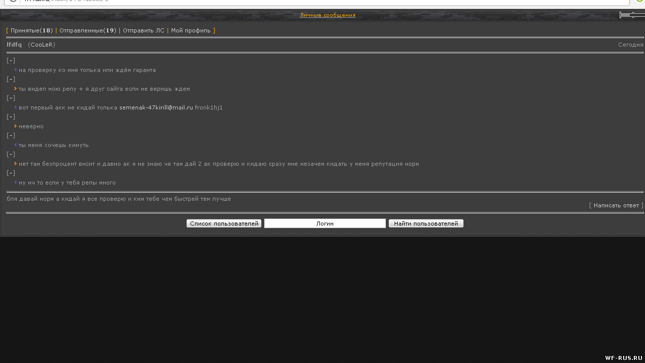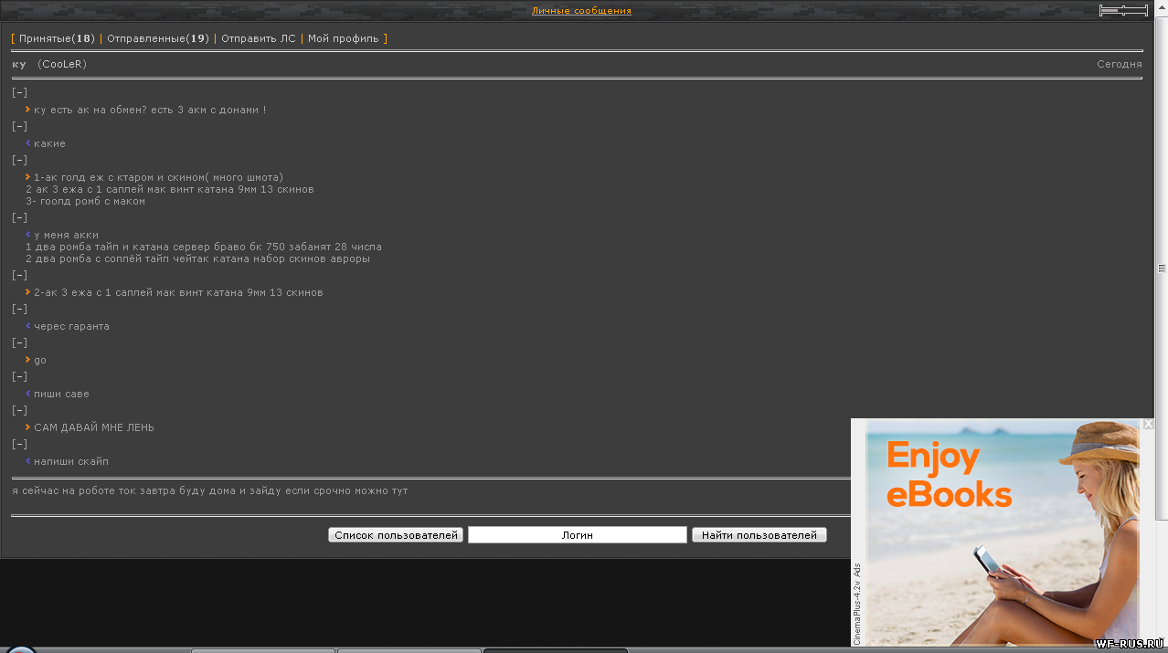 вот ещё одна падла CooLeR кинул на два аккаунта забаню аккаунт и не мне и не ему ку есть ак на обмен? есть 3 акм с донами ! [–] какие [–] 1-ак голд еж с ктаром и скином( много шмота) 2 ак 3 ежа с 1 саплей мак винт катана 9мм 13 скинов 3- гоолд ромб с маком [–] у меня акки 1 два ромба тайп и катана сервер браво бк 750 забанят 28 числа 2 два ромба с соплёй тайп чейтак катана набор скинов авроры [–] 2-ак 3 ежа с 1 саплей мак винт катана 9мм 13 скинов [–] черес гаранта [–] go [–] пиши саве [–] САМ ДАВАЙ МНЕ ЛЕНЬ [–] напиши скайп я сейчас на роботе ток завтра буду дома и зайду если срочно можно тут на проверку ко мне толька или ждём гаранта [–] ты видел мою репу + я друг сайта если не веришь ждем [–] вот первый акк не кидай толька semenak-47kirill@mail.ru fronk1hj1 [–] неверно [–] ты меня хочешь кинуть [–] нет там безпроцент висит и давно ак я не знаю че там дай 2 ак проверю и кидаю сразу мне незачем кидать у меня репутация норм [–] ну ич то если у тебя репы много бля давай норм а кидай я все проверю и кин тебе чем быстрей тем лучше